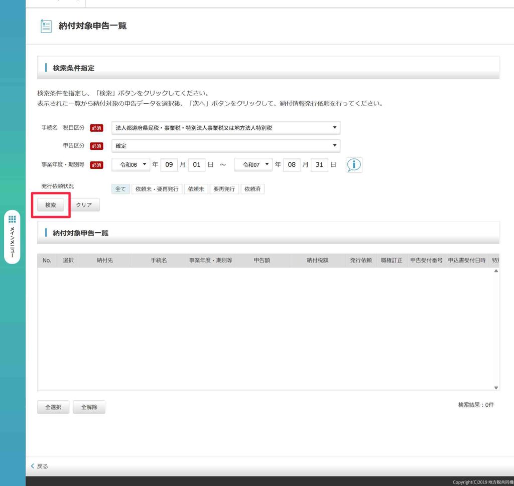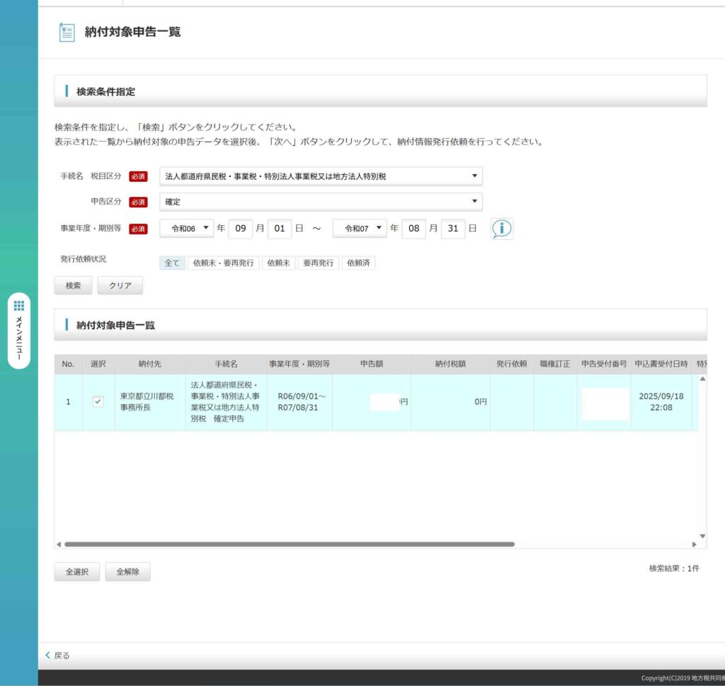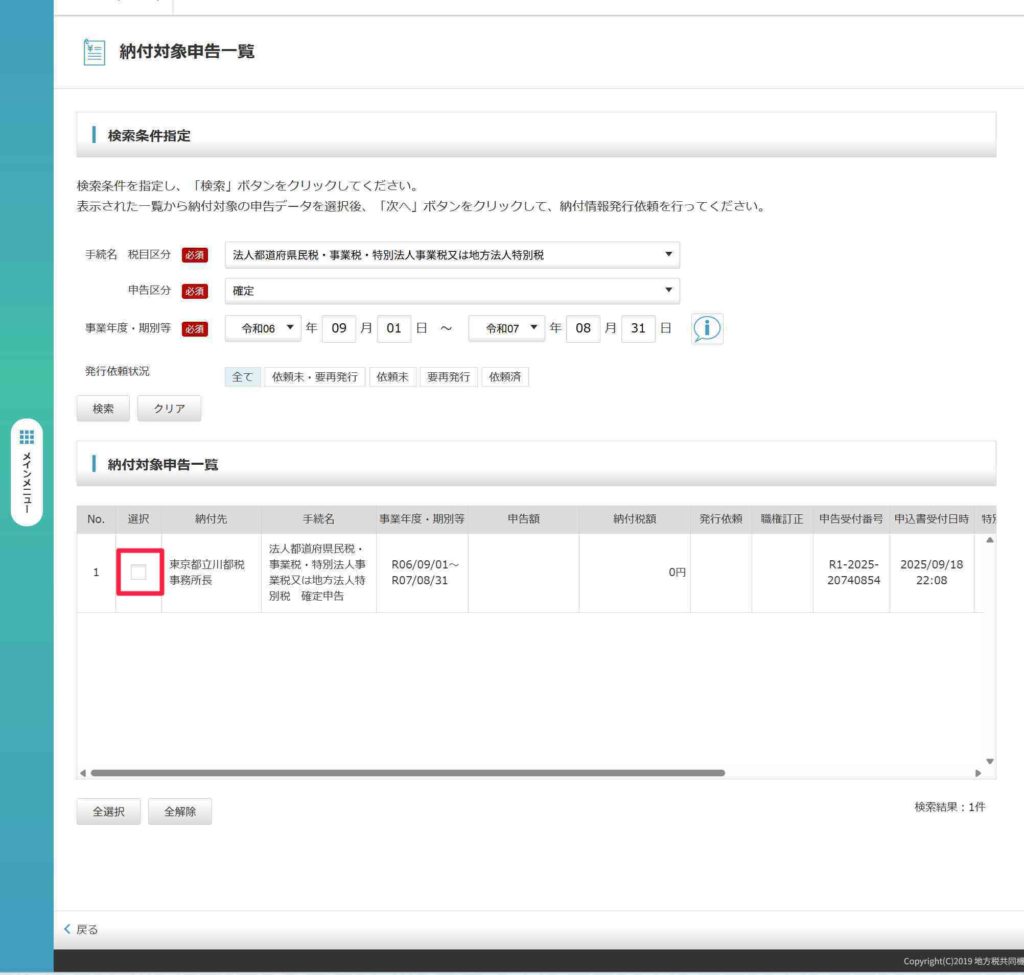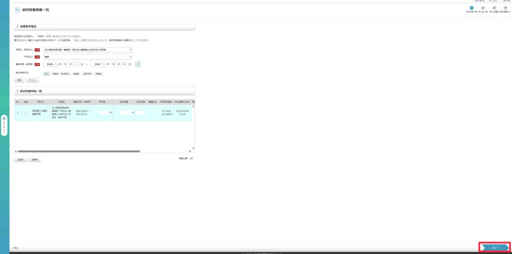 納付対象申告一覧に対象の申告書が表示されます