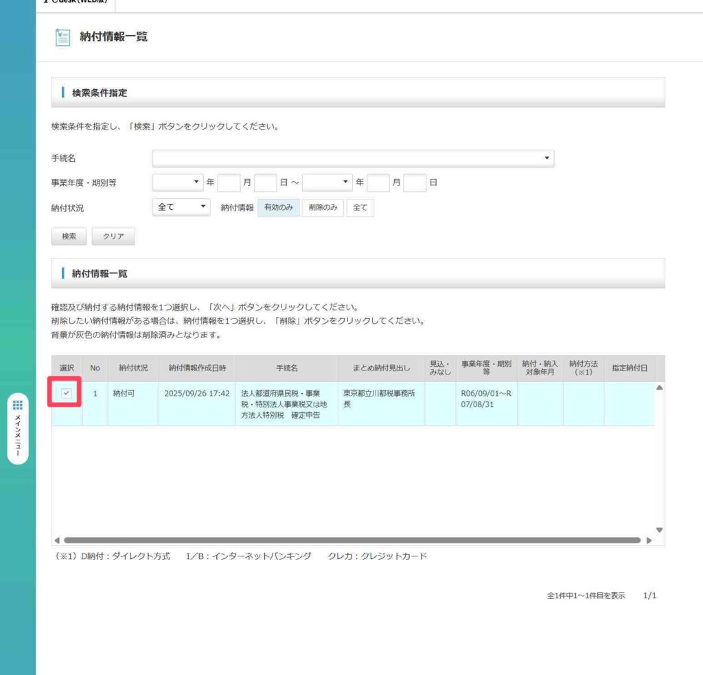 連携した納付情報にチェックします。