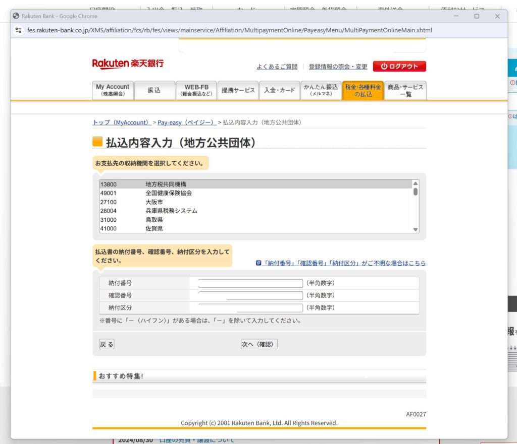 楽天銀行ではこのような画面で納付します。